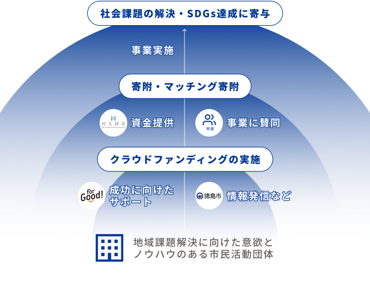 本事業は、徳島市による情報発信等のサポートのもと、地域課題解決に取り組む市民活動団体が事業費をクラウドファンディングで集め、集めた金額と同額を一般財団法人村上財団が支援するものです。また、ForGoodからクラウドファンディングのサポートを受けることができるほか、ファンドレイジングのノウハウを培い、継続的に事業を行っていくための支援についても実施します。