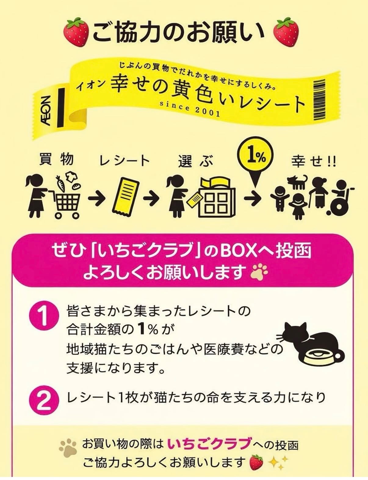 毎月11日に、お買い物の後にもらえる黄色いレシートを『いちごクラブ』のBOXへ投函していただくと、レシートの合計金額の1%が地域猫たちのご飯や医療費などの支援になります。
