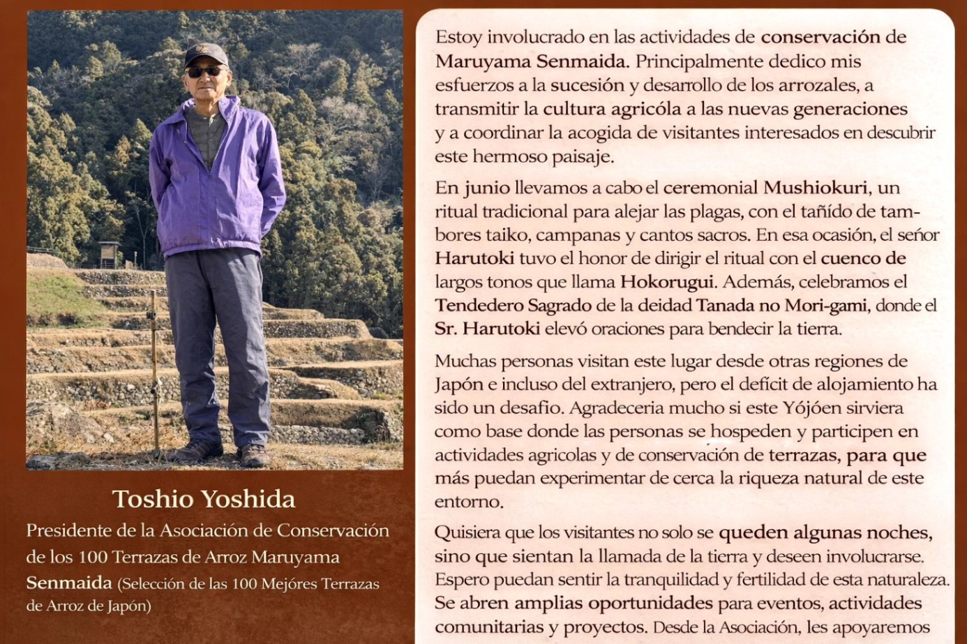 Además, trabajamos en la regeneración de tierras abandonadas, la agricultura sin pesticidas y la conservación del satoyama, transmitiendo a las futuras generaciones las tradiciones japonesas de oración, sabiduría cotidiana y cultura ancestral.