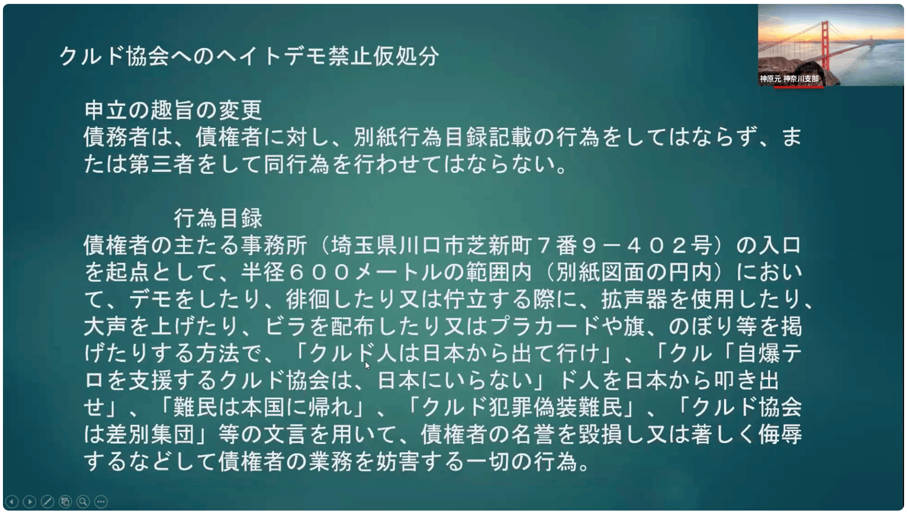 例えば、2016年6月に、川崎でヘイトスピーチのデモが起こったときには、その際の記者会見の様子もありますが、さっきのクルド文化協会が取ったのとそっくりの、ヘイトデモ禁止の仮処分を川崎でも取っています。