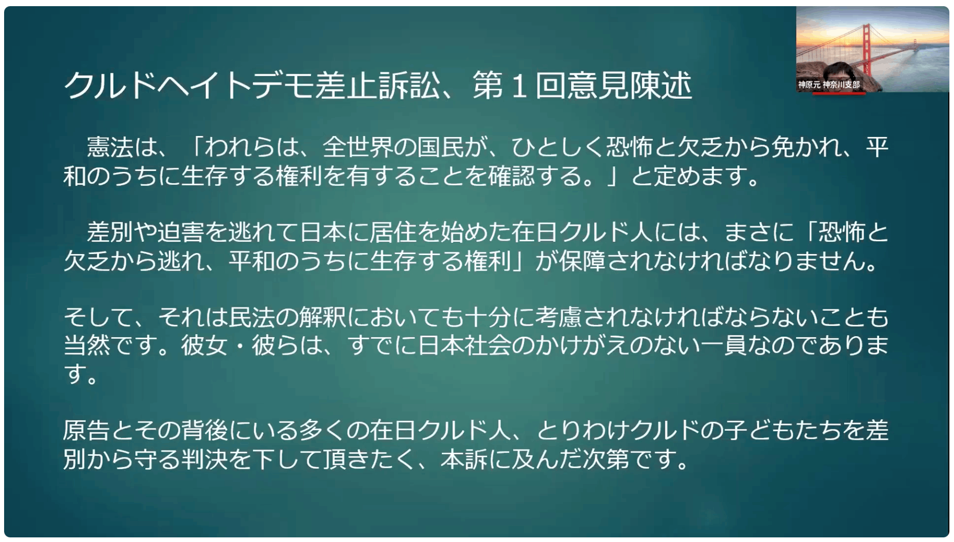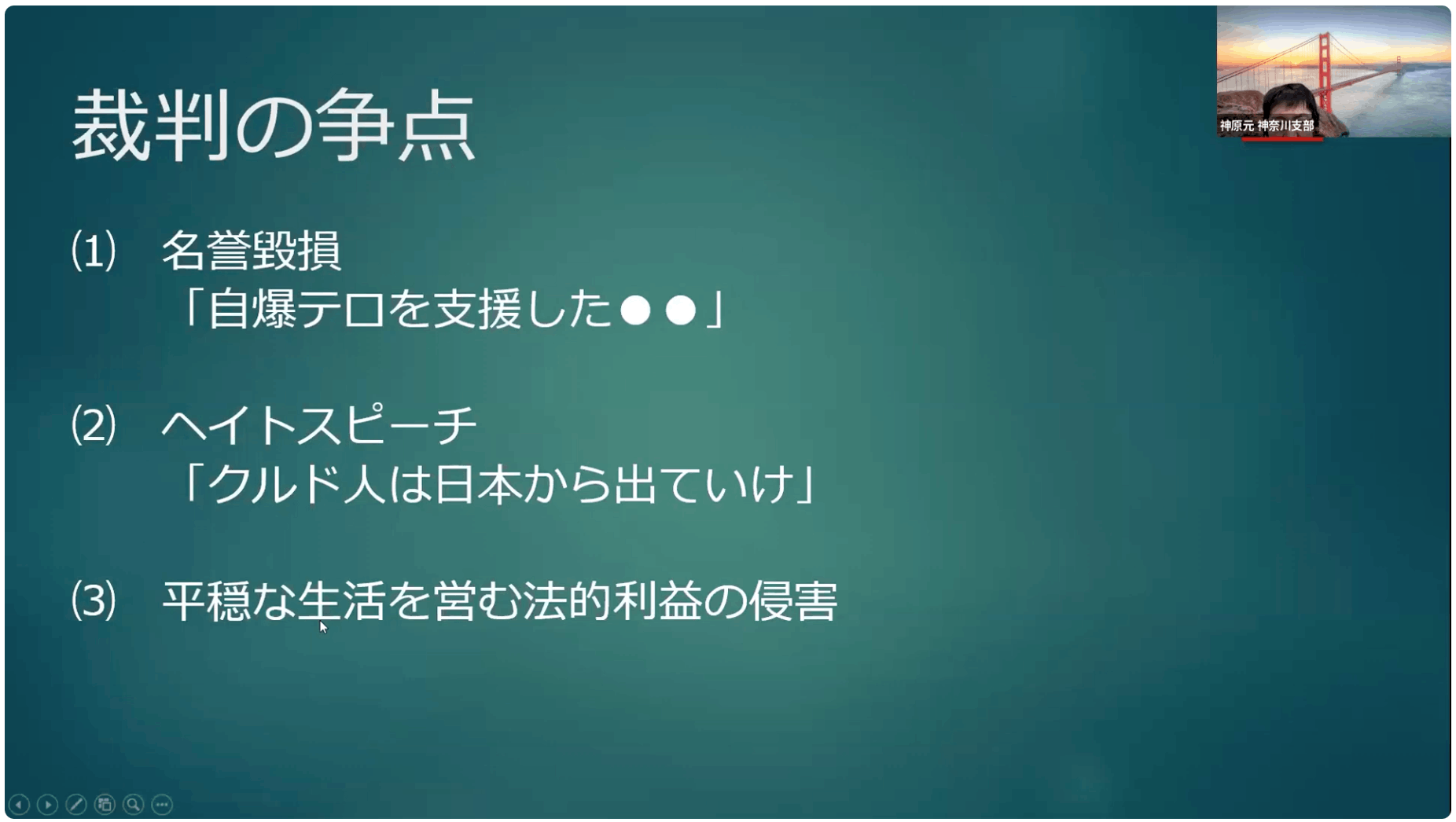 それから、ヘイトスピーチです。例えば、「クルド人は日本から出ていけ」といった、とんでもない発言ですが、この類の発言は、2016年に成立したヘイトスピーチ解消法でいうところの「不当な差別的言動」に当たるんだと。したがって、不法行為であり、損害賠償を支払え、という主張をしております。当然のことながら、クルドの方々が平穏な生活を営む、そういう生活を侵害しているんだ、つまり法的利益を侵害しているんだ、ということもあわせて主張しています。
