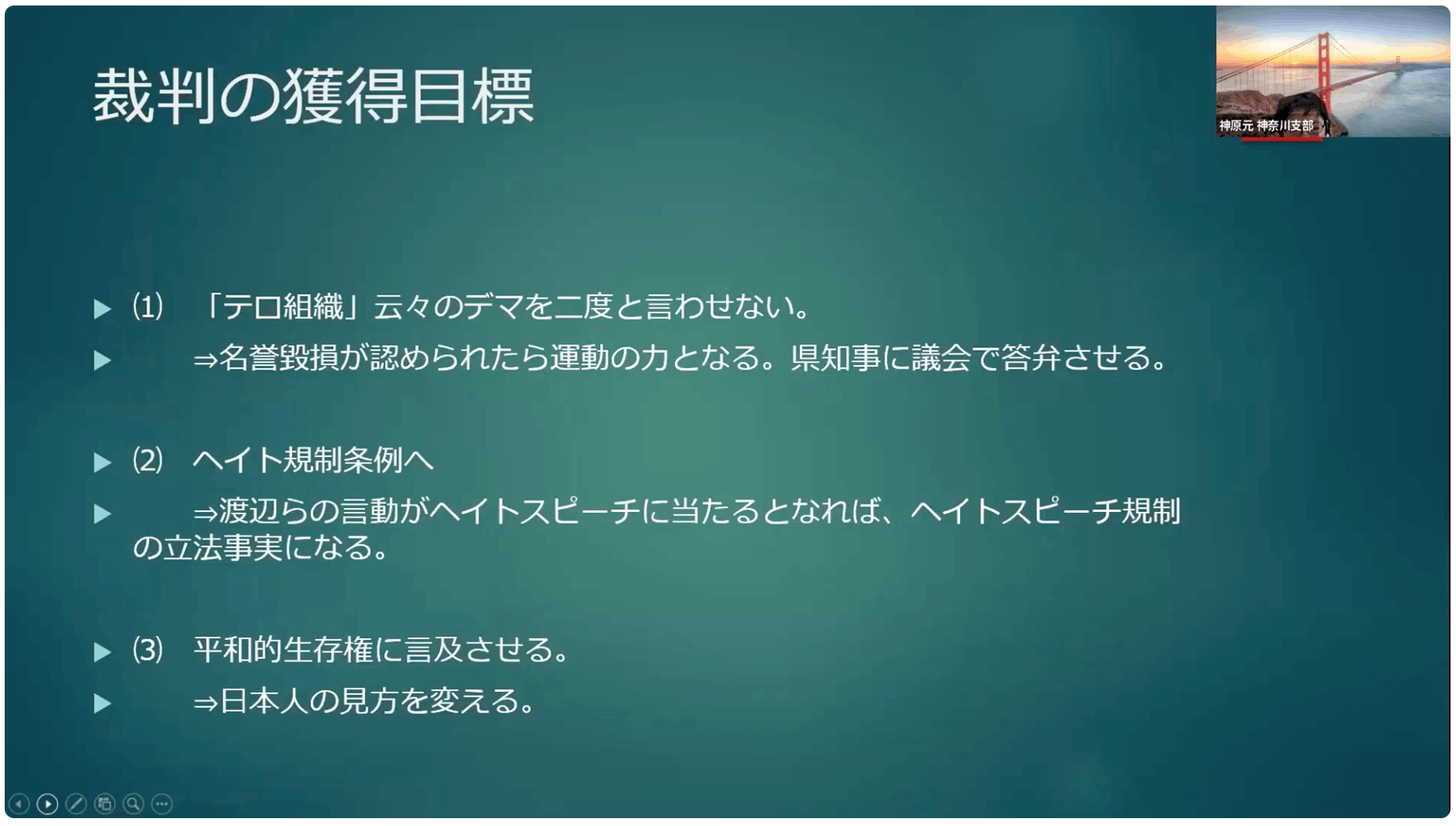 テロ組織云々、そんな事実はないんだと。これはデマであって、名誉毀損なんだ、ということをきっちり認めさせたい。そういう認定を、我々は獲得したいというふうに思います。
