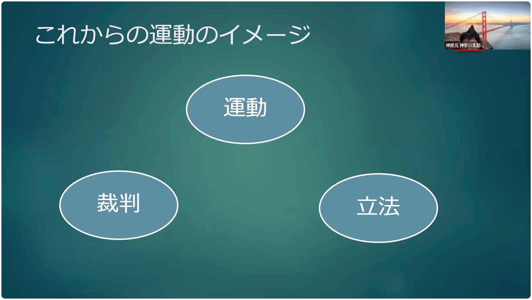 つまり、運動があり、裁判があり、立法がある。この三つが連携することが、ものすごく大事なんだと、僕は思っています。