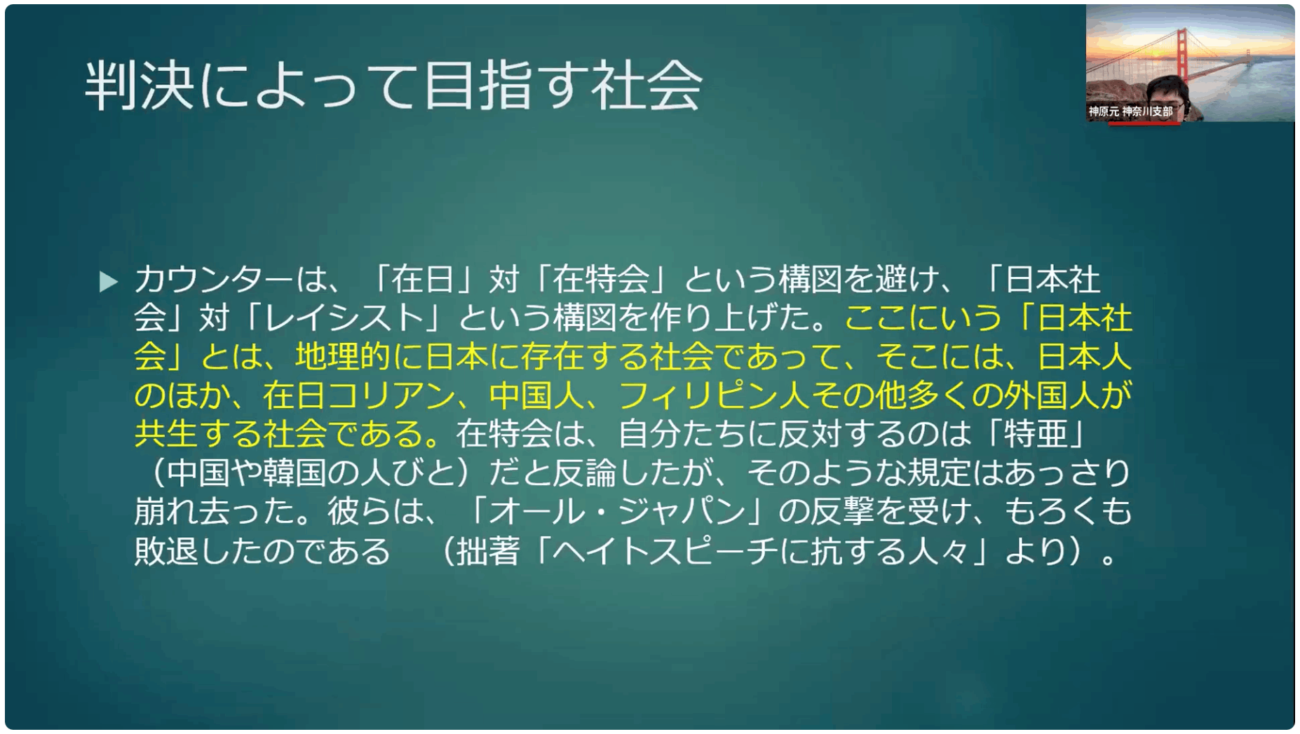 ですから、この三つを決してバラバラのものだと考えずに、運動と裁判、そして立法がうまく連携することによって、ヘイトスピーチをなくしていくことができるんだ、ということを、改めて皆さんと一緒に確認したいと思っています。