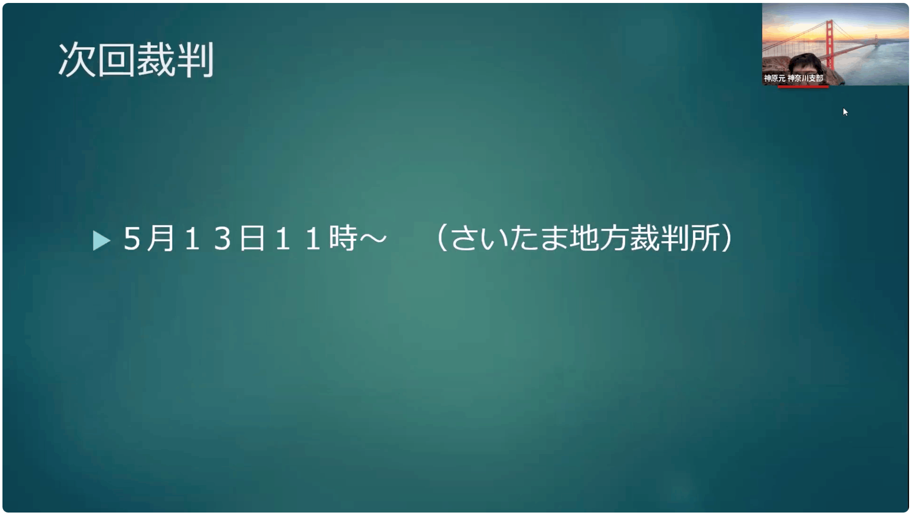 師岡さん(弁護団の一人)から強く言われているので、申し上げますと、次回の裁判が、5月13日の11時から、埼玉地方裁判所で行われます。ぜひこちらにご参集いただきたいと思います。