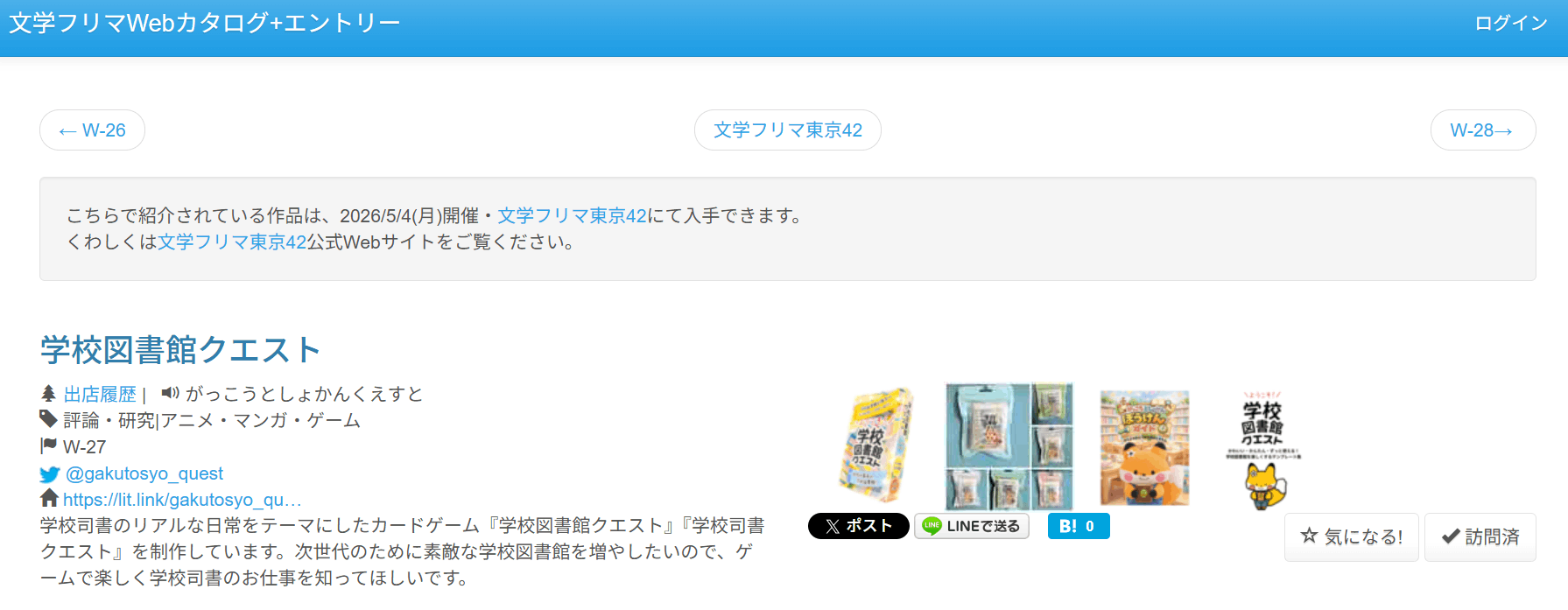 本リターンの『学校図書館クエスト(名刺サイズ・簡易パッケージ)』は、5月4日開催の『文学フリマ東京42』および5月24日開催の『ゲームマーケット2026春』にて販売予定のものと同一の製品です。