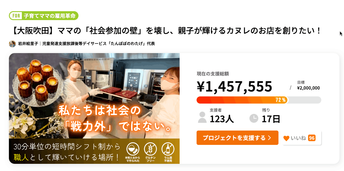 【大阪吹田】ママの「社会参加の壁」を壊し、親子が輝けるカヌレのお店を創りたい!