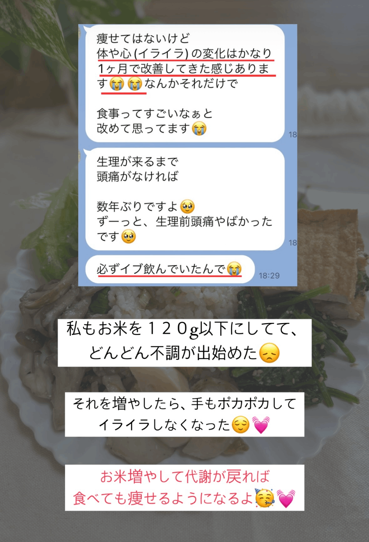 私自身も、お米の量を増やしたことで「手がポカポカして、イライラしなくなった」という経験があります。お米を増やすことで代謝が戻れば、結果として「食べても痩せる」体質へと繋がっていくのです。