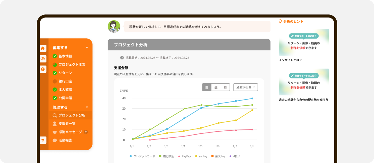 支援金額の推移や流入経路など、さまざまな数字が一目でわかる分析画面を使って 目標達成までの戦略を立てることができます。
