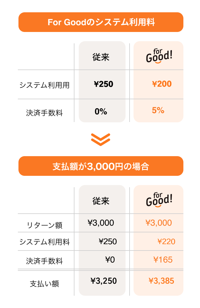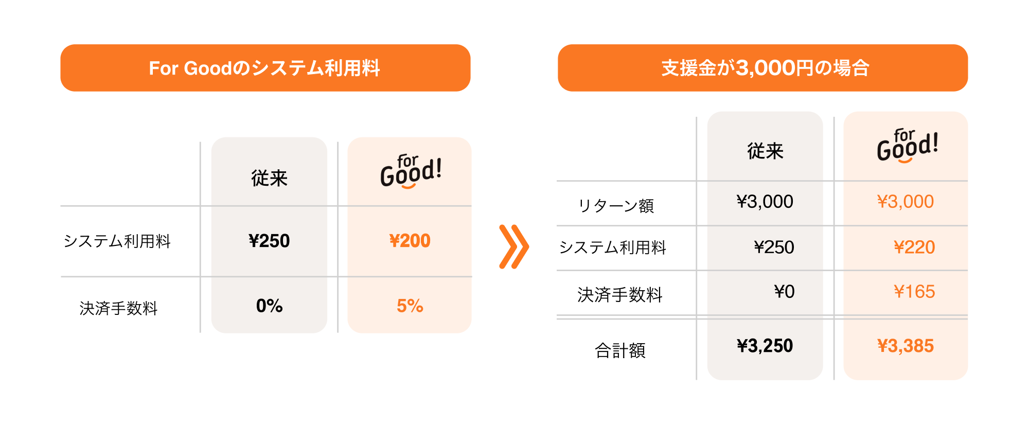 手数料:For Goodのシステム利用料200円(税別)+クレジットカードの決済手数料5%(各種税別)